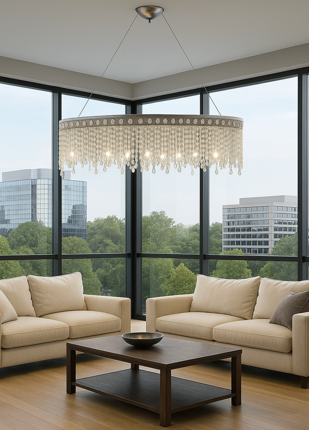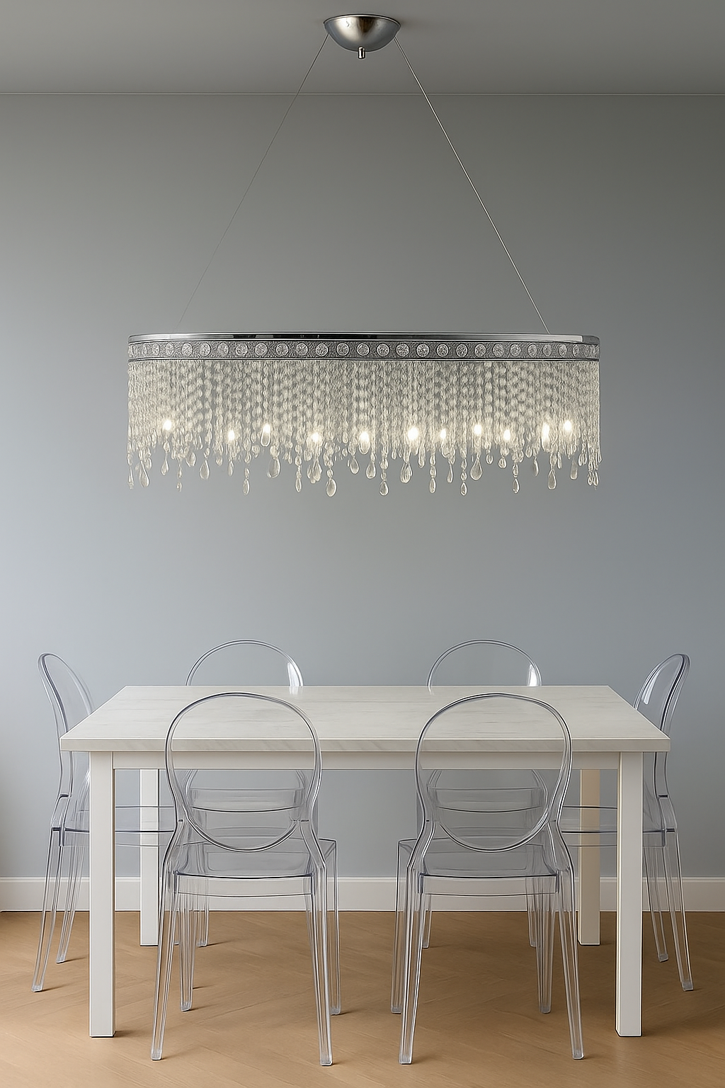Lampadario a sospensione dal design contemporaneo, realizzato in ottone con finitura cromo e arricchito da preziosi ottagoni in cristallo che creano eleganti giochi di luce. La sua forma ovale lo rende perfetto per illuminare un tavolo da pranzo, un soggiorno moderno o un ambiente contract di alta gamma.