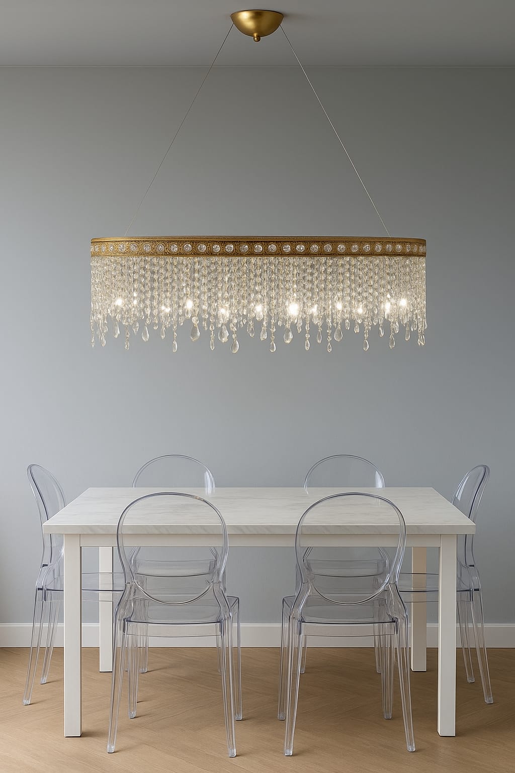 Lampadario a sospensione dal design contemporaneo, realizzato in ottone con finitura oro satinato e arricchito da preziosi ottagoni in cristallo che creano eleganti giochi di luce. La sua forma ovale lo rende perfetto per illuminare un tavolo da pranzo, un soggiorno moderno o un ambiente contract di alta gamma.