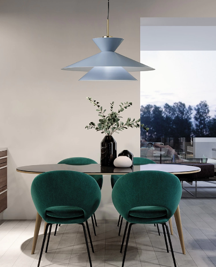 Un lampadario a sospensione, posizionato in un punto centrale della stanza, è quasi sempre necessario e nel caso in cui la zona non sia ampia potrebbe essere sufficiente. Anche in questo caso però è ugualmente interessante giocare con elementi differenti.