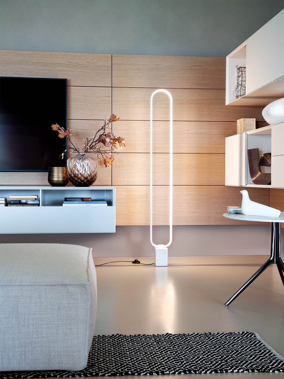 Si tratta di un luogo dove più aree funzionali coesistono insieme armonicamente e per questo la luce gioca un ruolo essenziale per il benessere e per la definizione dello spazio. Essa infatti deve essere proporzionata alla dimensione del salotto.