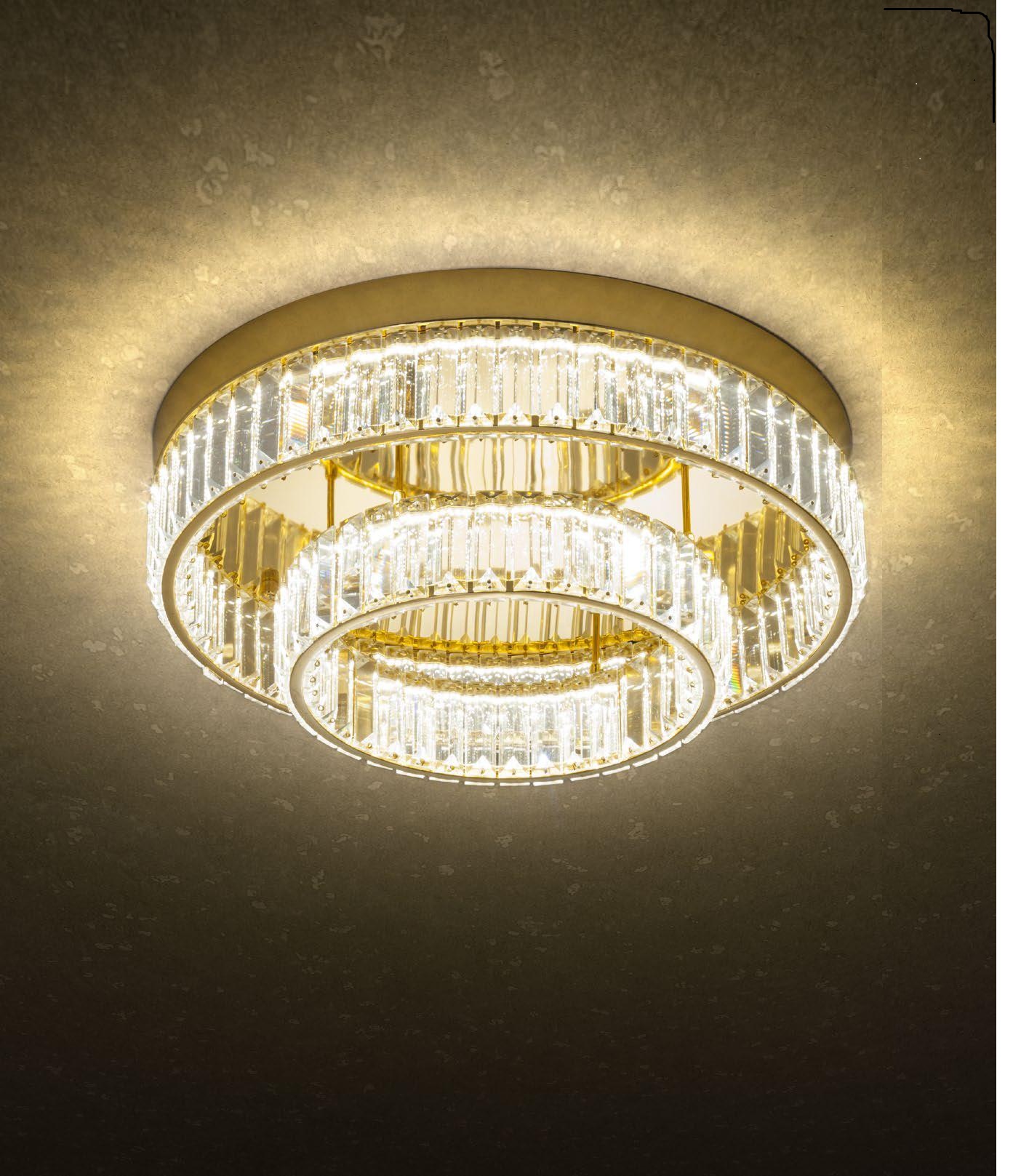 La plafoniera Akala unisce stile, tecnologia e raffinatezza . Realizzata in metallo dorato e impreziosita da cristalli decorativi, dona agli ambienti un tocco di eleganza.