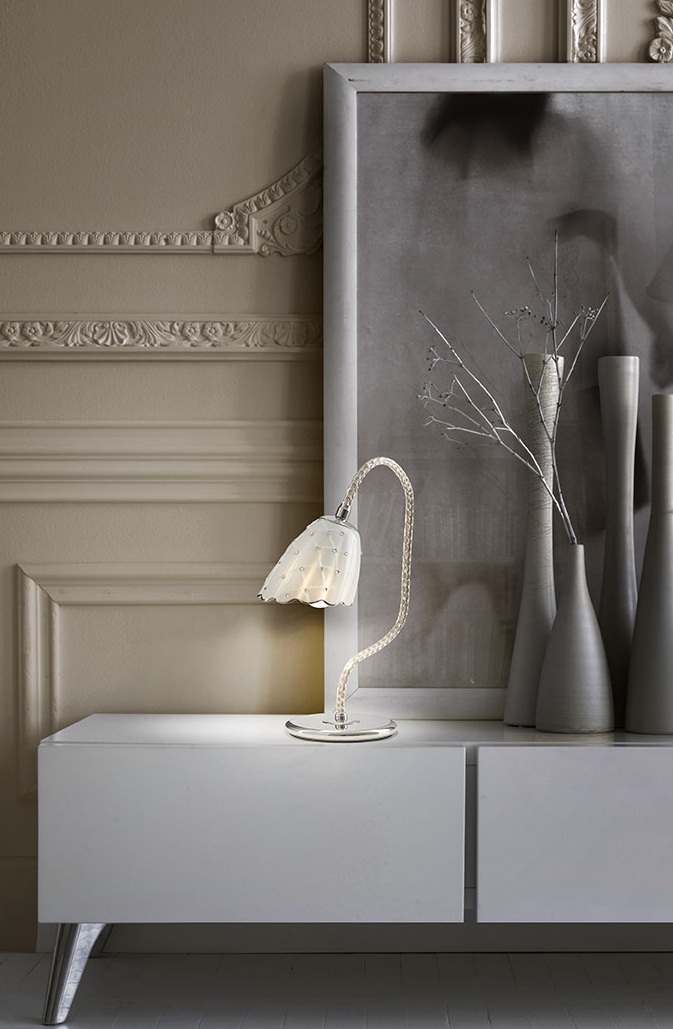 Il paralume è bianco marmorizzato e passamaneria argento.
