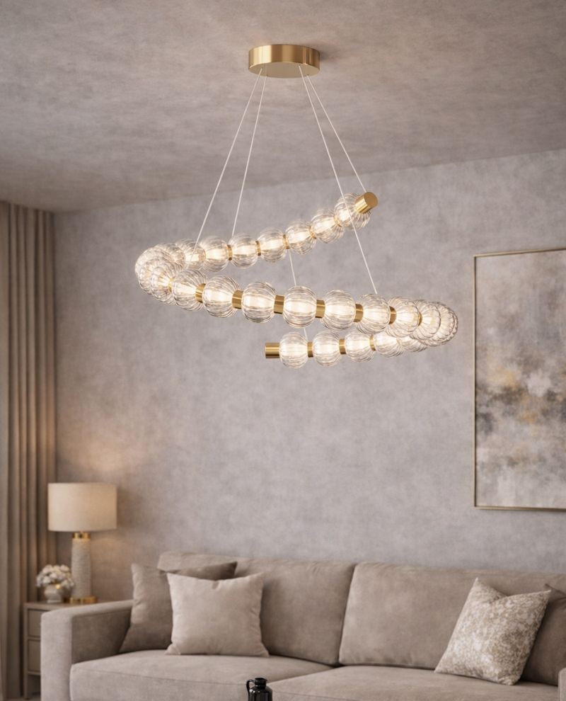 La sorgente LED integrata da 40W è nascosta all’interno delle sfere tramite un diffusore in acrilico, garantendo una distribuzione uniforme della luce a 360°. La luce bianca calda da 3000K, con un flusso luminoso di 1900 lumen, crea un’atmosfera accogliente e sofisticata, ideale per soggiorni, sale da pranzo, open space e ambienti contract.