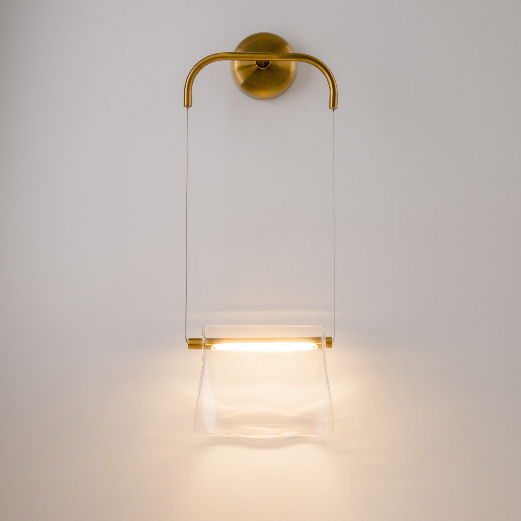 L’applique LED Maytoni Cabaret è una lampada da parete di design che si distingue per la raffinata finitura in ottone e il diffusore in vetro trasparente.