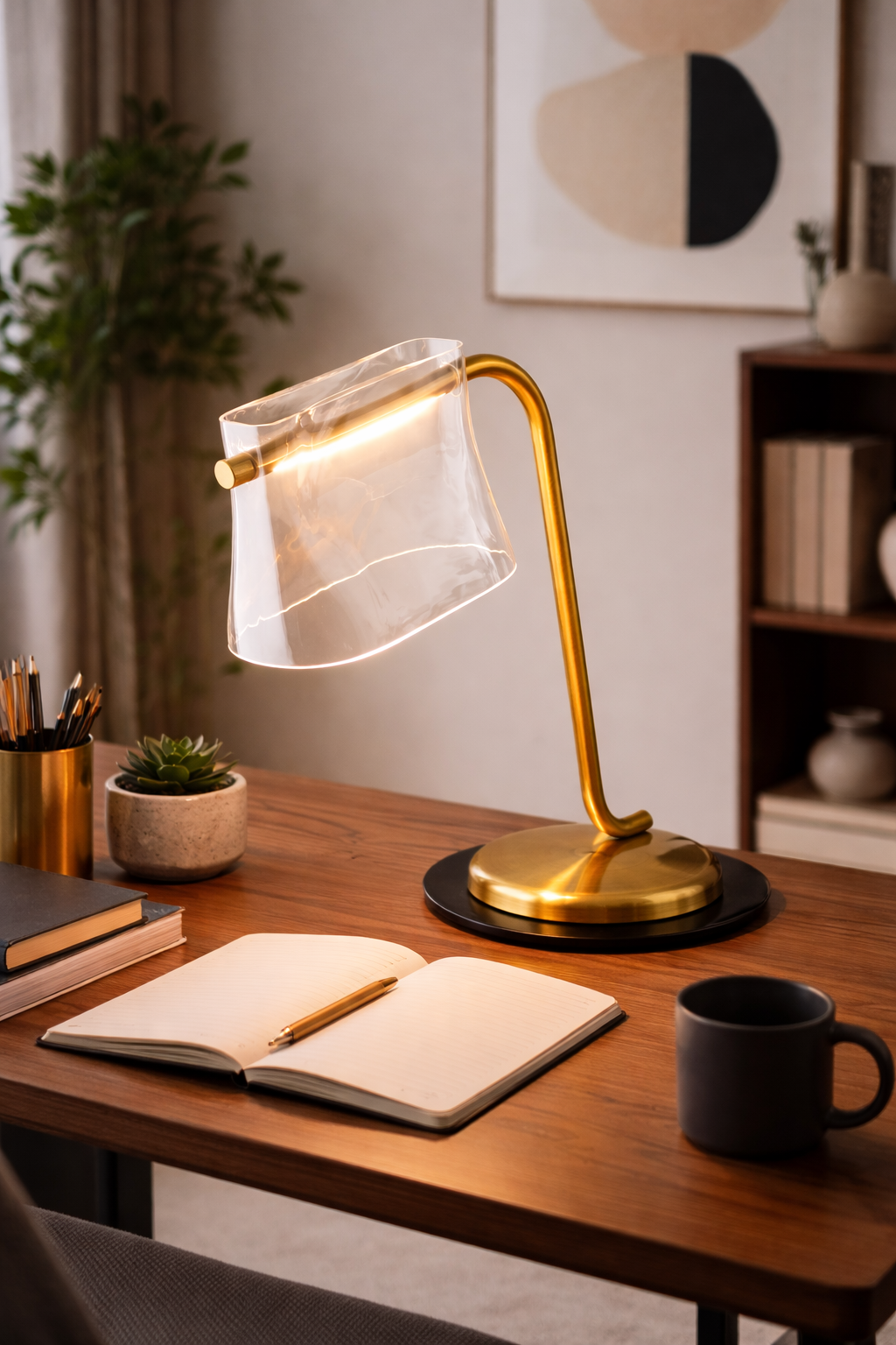 Cabaret è una lampada da tavolo elegante ed originale, perfetta per ambienti moderni e raffinati. La struttura in metallo con finitura ottone regala raffinatezza, mentre il diffusore in vetro trasparente crea un effetto luminoso morbido e avvolgente, ideale per living, camere da letto e studi.