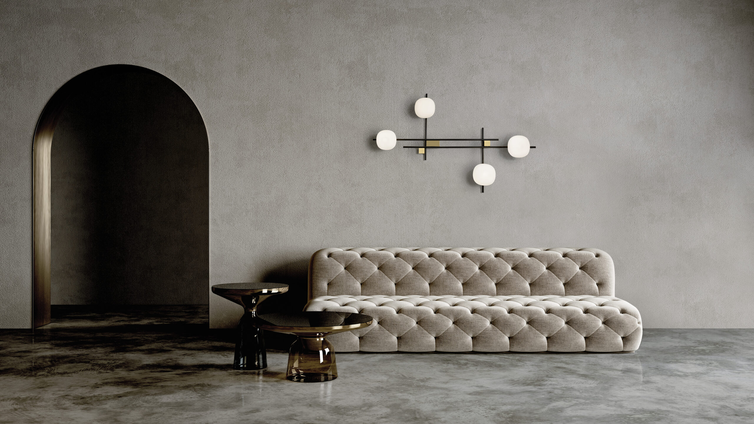 La struttura ortogonale dona equilibrio e forza geometrica, mentre le finiture metalliche e i volumi tridimensionali creano un contrasto elegante e prezioso.